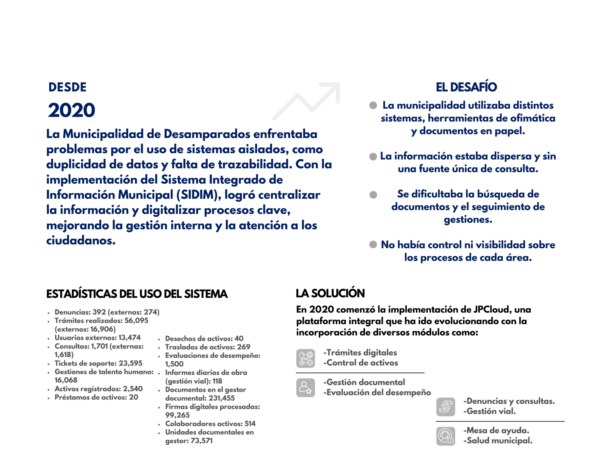 Desde el año 2020, la Municipalidad de Desamparados enfrentaba el reto de operar con múltiples sistemas y herramientas aisladas, lo que generaba problemas como duplicidad de datos, falta de trazabilidad, errores humanos por reprocesos, y dificultades para acceder a información clave en tiempo real. Con la implementación del Sistema Integrado de Información Municipal (SIDIM) se logró centralizar la información y digitalizar procesos clave, impactando positivamente tanto a los funcionarios como a los ciudadanos.